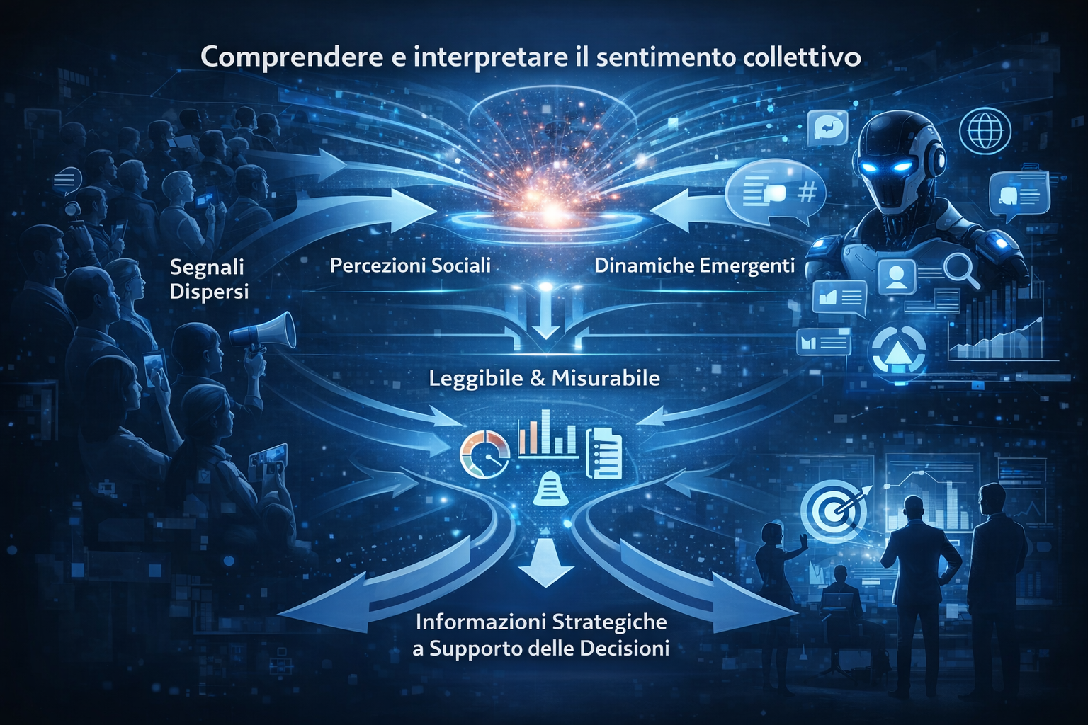 Comprendere e interpretare il sentimento collettivo per renderlo leggibile, misurabile e utilizzabile in modo consapevole, trasformando segnali dispersi, percezioni sociali e dinamiche emergenti in informazioni strategiche a supporto delle decisioni.